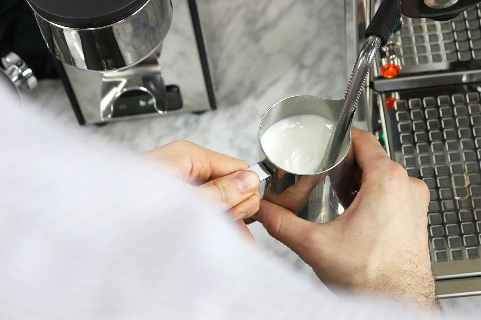 - The Gentle Swirl: After tapping, give the jug a gentle swirl. This integrates the foam with the heated milk, creating a glossy, uniform texture known as microfoam—the secret to latte art. You can learn more about this in our [guide to mastering latte art at home].